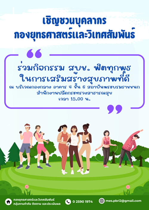 เชิญชวนบุคลากร กองยุทธศาสตร์เเละวิเทศสัมพันธ์ร่วมกิจกรรม สบช. ฟิตทุกพุธ ในการเสริมสร้างสุขภาพที่ดี
